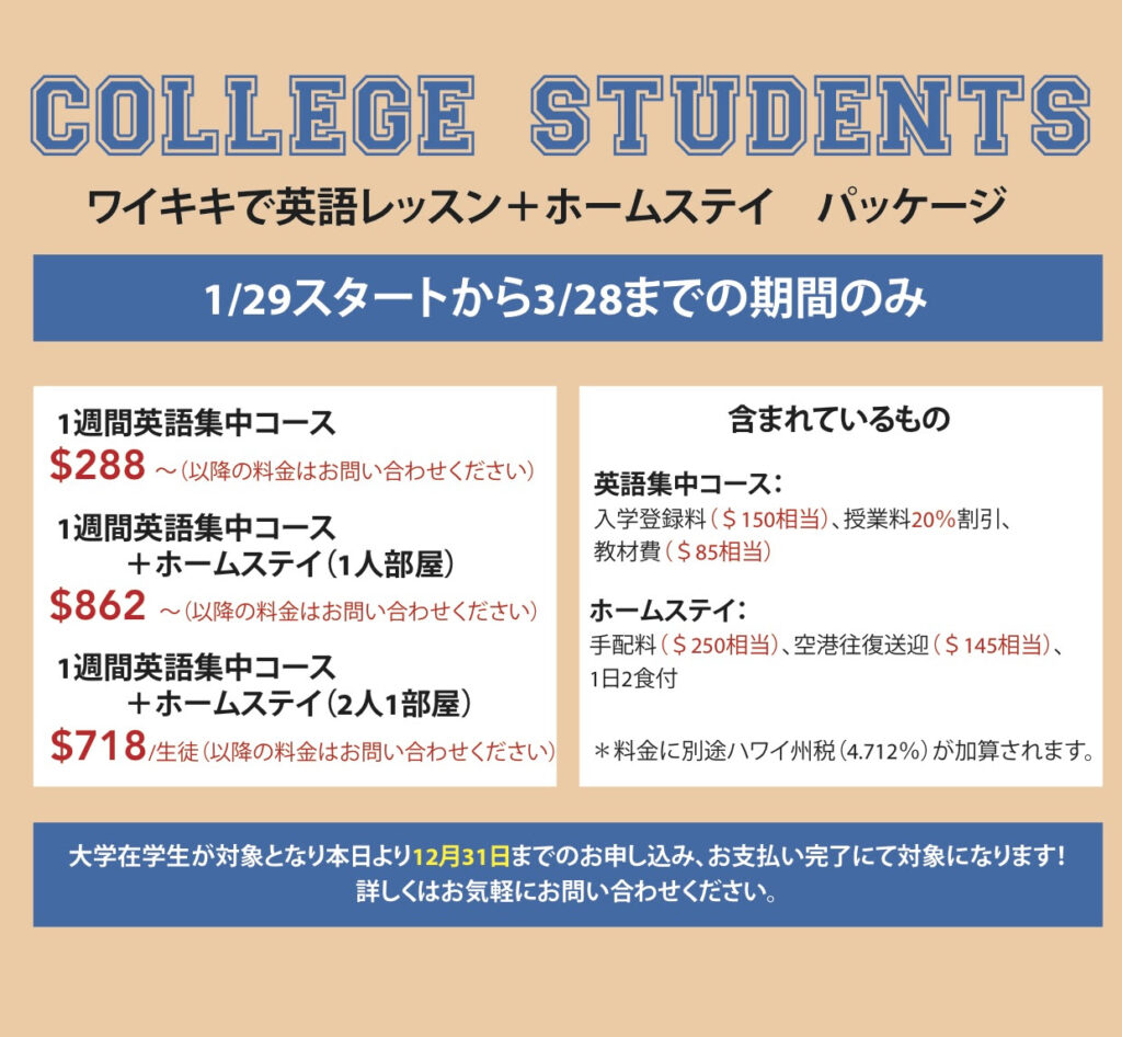 迎える大学生に向けて、ハワイでプチ留学体験を特別価格にてご提供いたします。